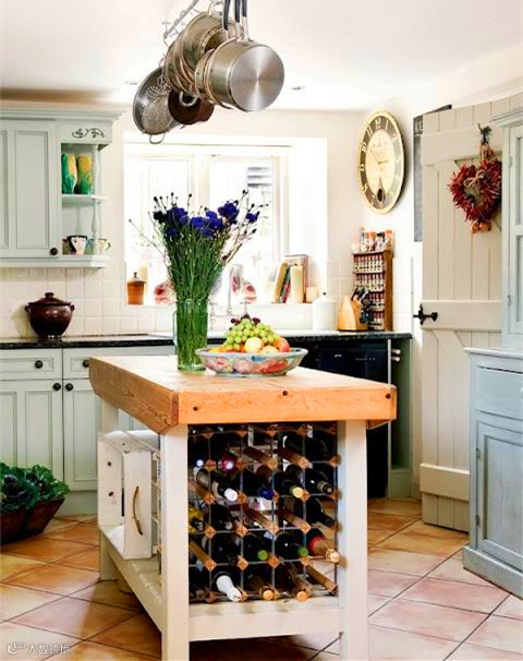 如果你过的是西式生活,如果你的厨房气温不高,那么你可以考虑一下将厨房的桌子改造成小酒柜。节省空间之余,还能给厨房增添点小细节。但如果你厨房是多油烟的话,就要慎重了。