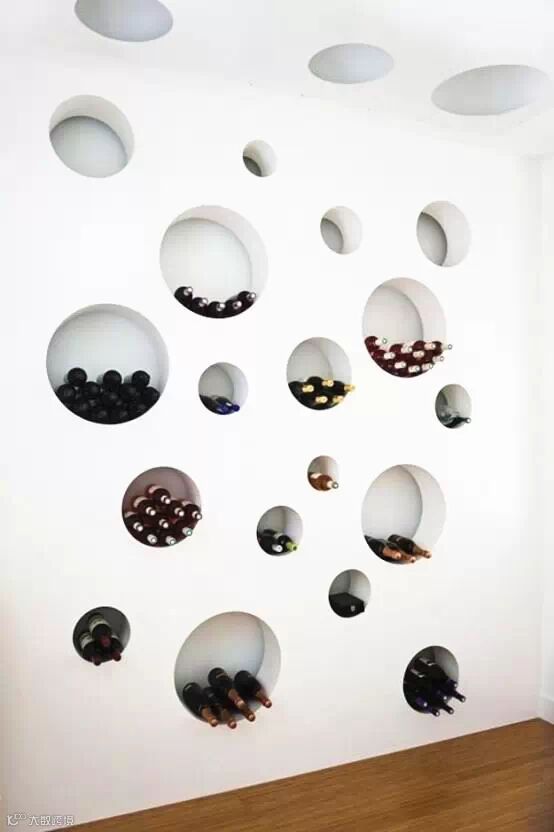 如果你觉得墙壁上的方格酒柜有点古板,你可以选择圆圈型的,是不是有点活泼的感觉?