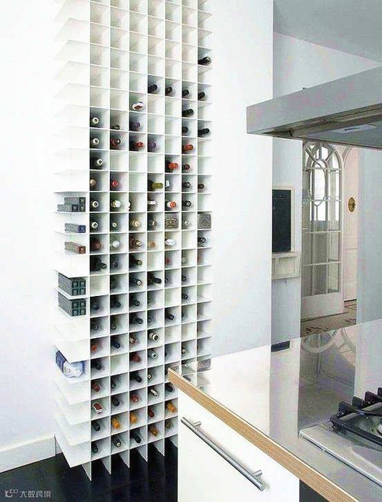 乍看还以为这酒柜是从墙壁上长出来的,其实这是一个利用柱子和墙壁的空间打造出来的酒柜。你是不是经常烦恼家里的柱子有点浪费空间?这个方案就很好地解决了你的烦恼,而且高高的酒柜如果摆满酒的话显得很气派。