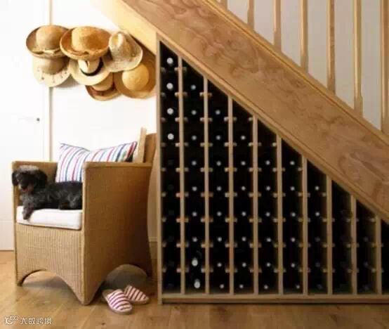 楼梯下的空间只能做杂物间?这你就真的是浪费了。阴凉的楼梯下空间其实是存放红酒的好地方,不过小心你的脚步要放轻一点。