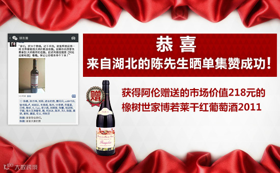“您晒单集赞、阿伦来赠酒”活动持续引爆阿伦粉丝热情,大家纷纷参与晒单赠酒活动。其中,来自湖北的陈先生晒单集赞成功,成为4月24日的“幸运之星”,免费获赠市场价值218元的法国橡树世家博若莱干红葡萄酒一瓶!