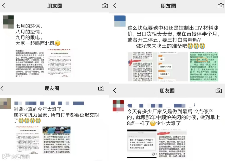 “熬过了7月的环保,挺住了8月的疫情,却撑不住9月的限电,10月嘴张大点喝西北风吧。” “消息好突然,我们无法按时完成客户的订单了……” “无能为力,只能放假。”
