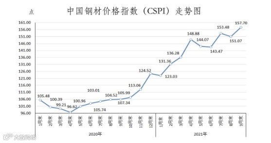 回看数据显示,2021年9月末,中国钢材价格指数为157.70点,与上年同期相比上升51.71点,升幅达48.79%。