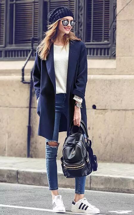 优雅的藏蓝色,随性慵懒的系带毛呢外套,搭配卫衣和破洞牛仔裤,街头休闲欧美风。