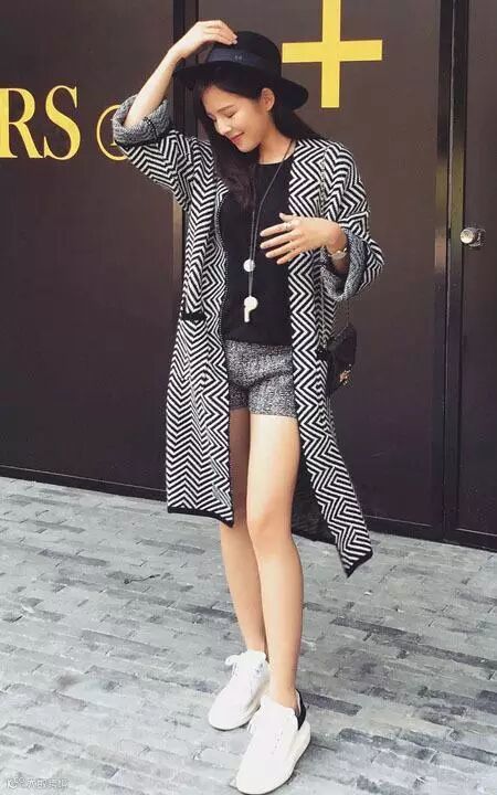 亮眼提气的黑白撞色针织开衫,折线花纹极具视觉冲击力,内搭打底衫,配上灰色花呢短裤和休闲板鞋,轻松穿出随意feel。