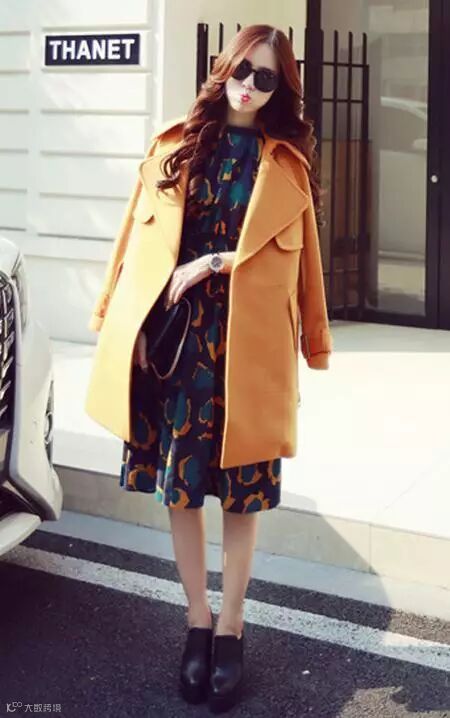 英伦气质的呢大衣,经典的大翻领设计,时尚简约,口袋设计,方面实用,内搭连衣裙,欧美范十足。