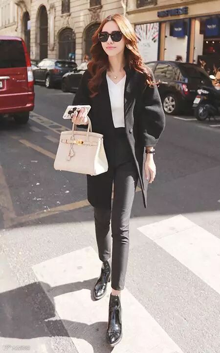 百搭又提气的黑色毛呢大衣,简约大方又满有设计感的样式,上身时髦有范,内搭白色打底衫,配条修身打底裤,尽显街头达人魅力。
