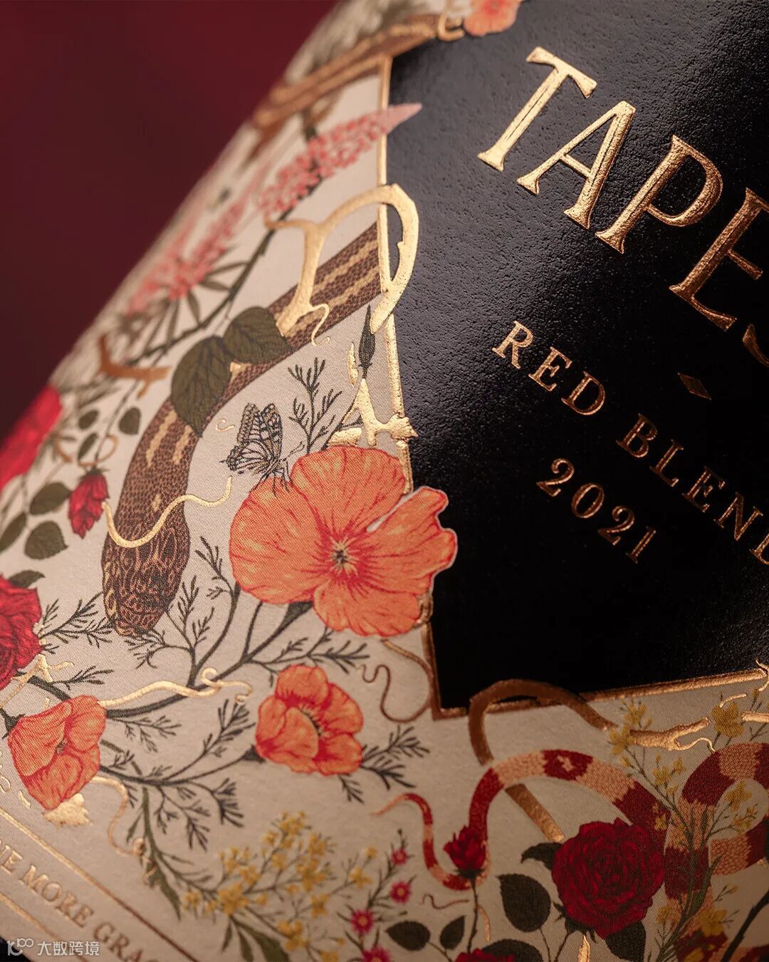 Tapestry 织锦的酒标设计本身就是一件艺术品。酒标既是字面意义上的织锦,也是隐喻意义上的织锦。其细致的设计和丰富温暖的色调让人联想到纺织品本身。