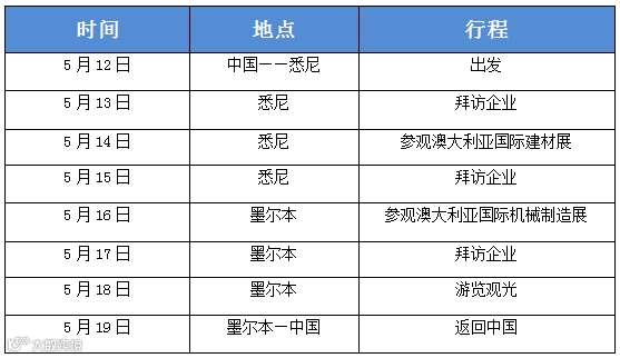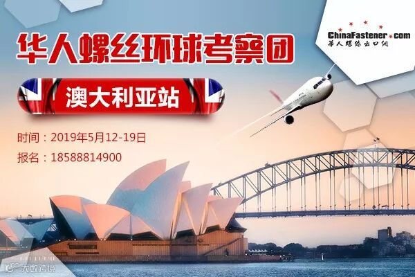 为深入了解澳大利亚紧固件行业市场,促进中澳紧企的交流与发展,华人螺丝出口网将于2019年5月12日至5月19日,组织为期8天的澳大利亚紧固件市场及文化考察之旅。本次行程将参加澳大利亚国际机械制造周展和澳大利亚国际建材展,以及拜访若干家全球知名紧固件企业。