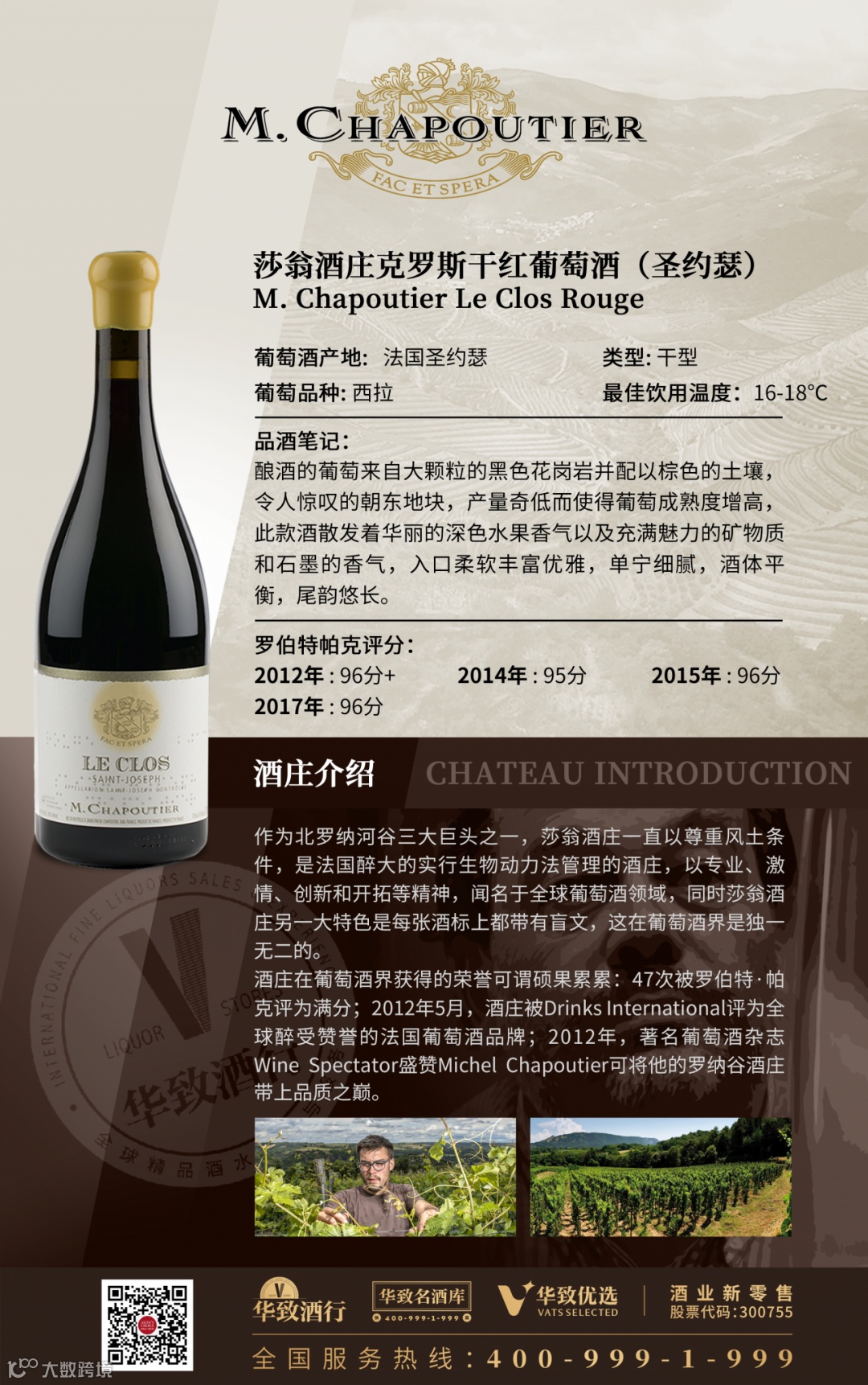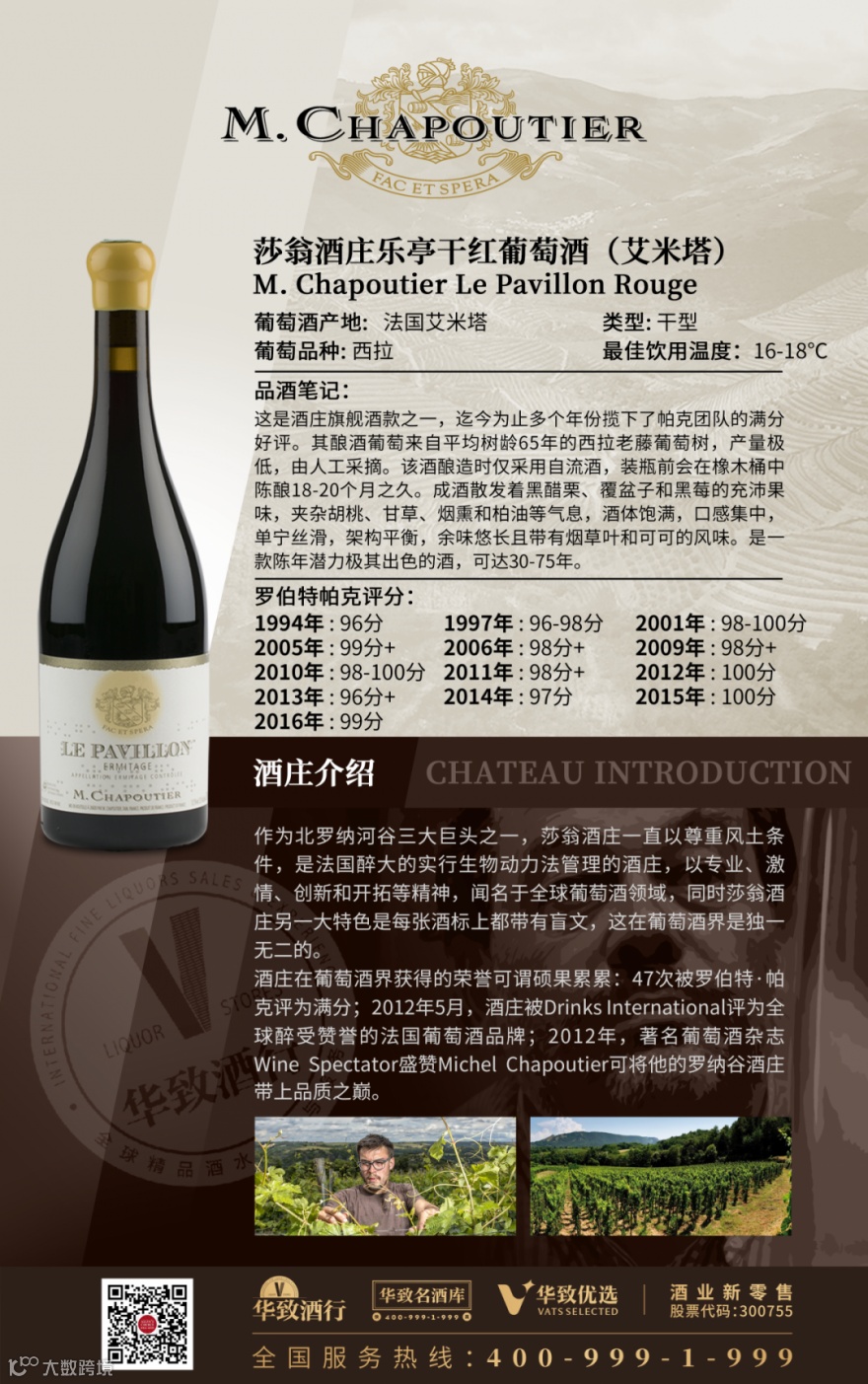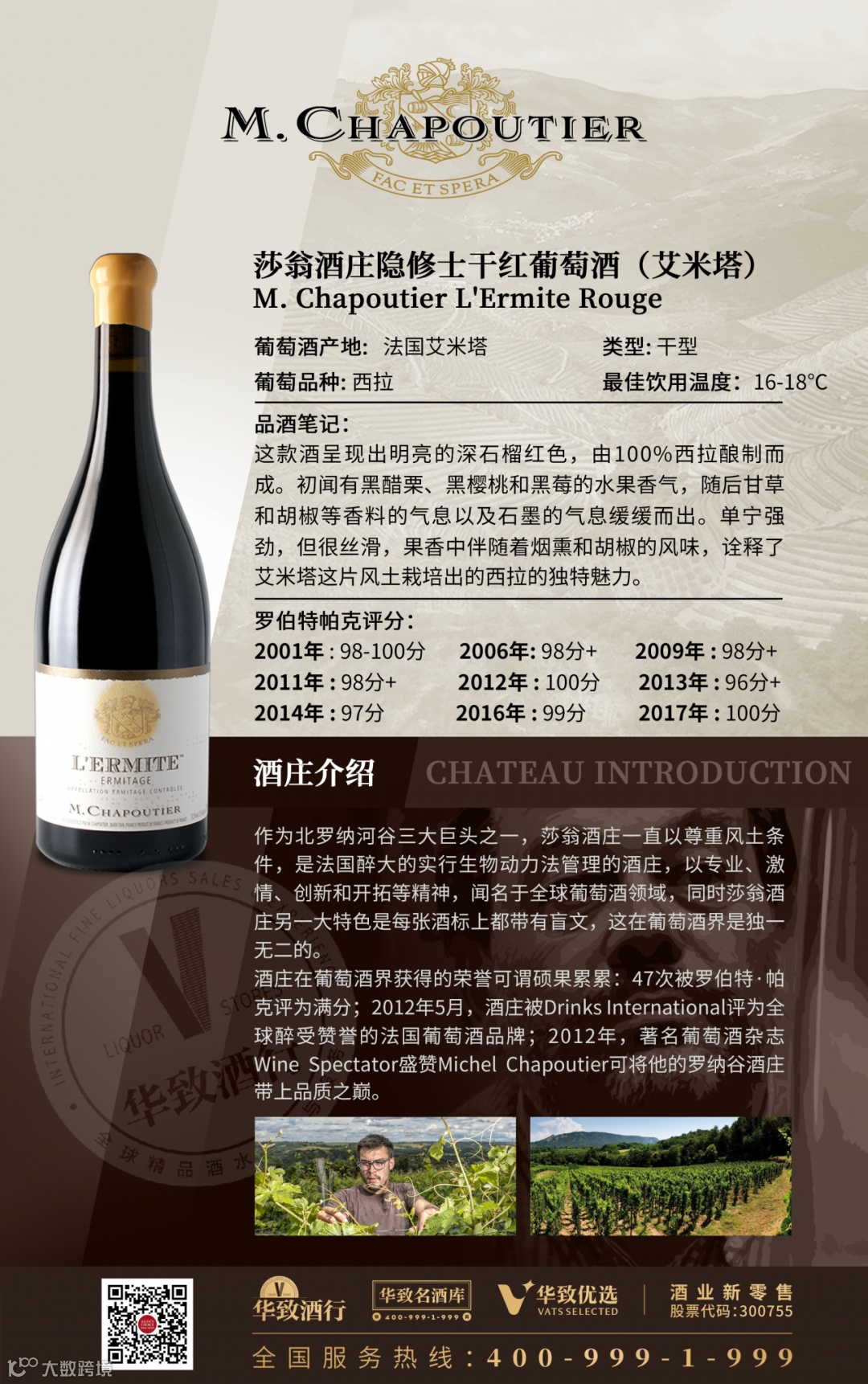 同时,酒庄在葡萄酒界获得的荣誉可谓硕果累累:47次被罗伯特·帕克评为满分,Drinks International评选其为全球醉受赞誉的法国葡萄酒品牌;著名葡萄酒杂志Wine Spectator盛赞米歇尔·莎翁(M.Chapoutier)可将他的罗纳谷酒庄带上品质之巅.....