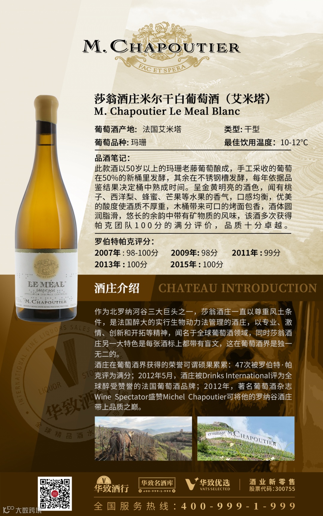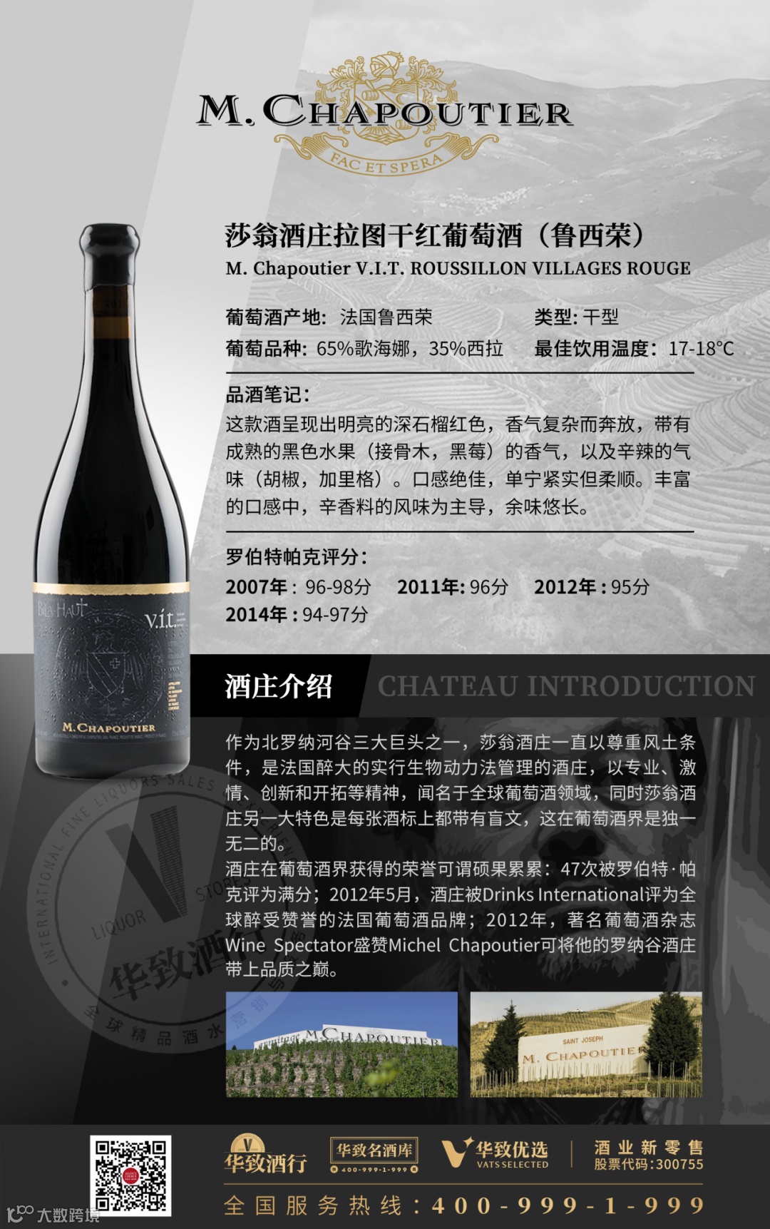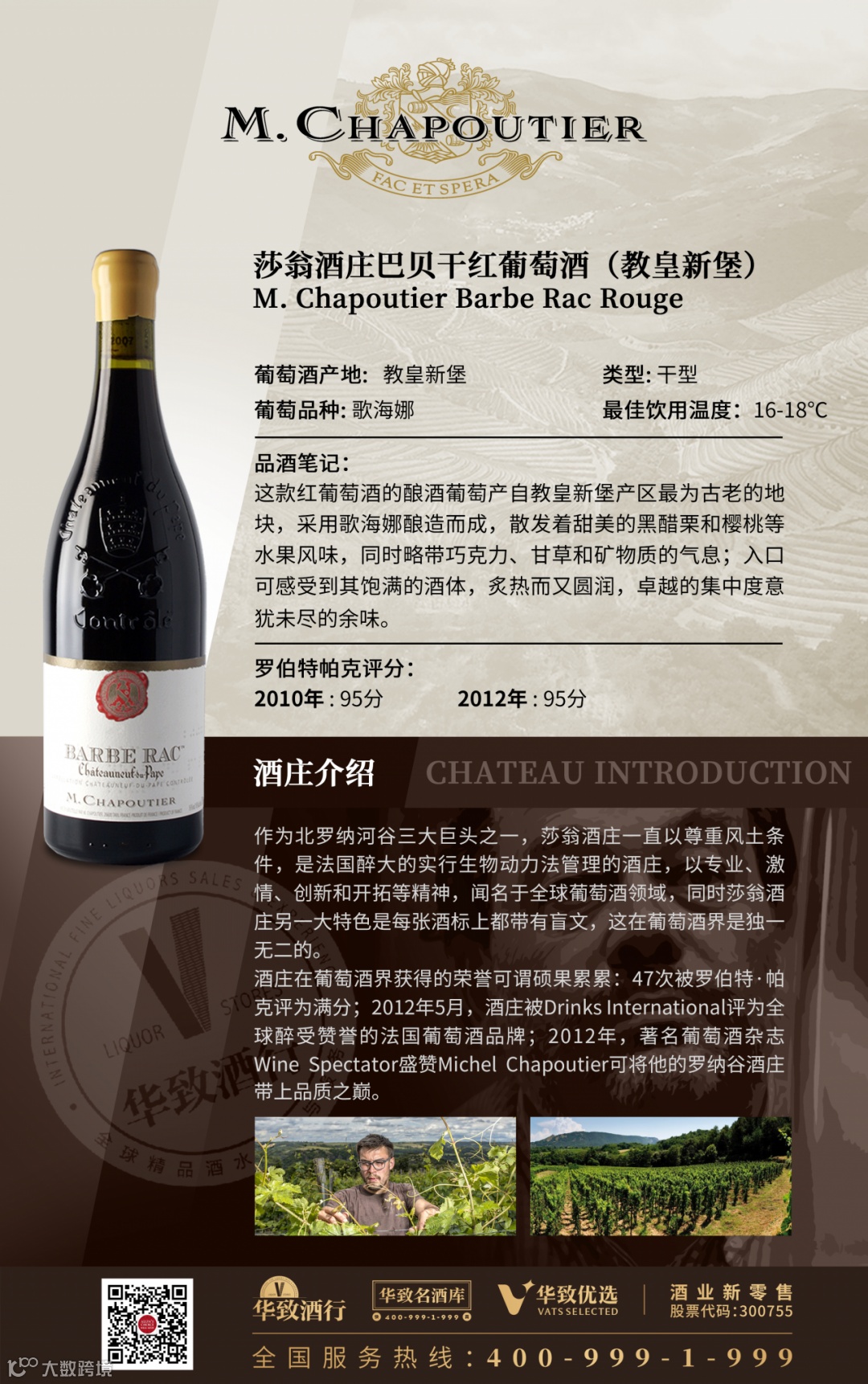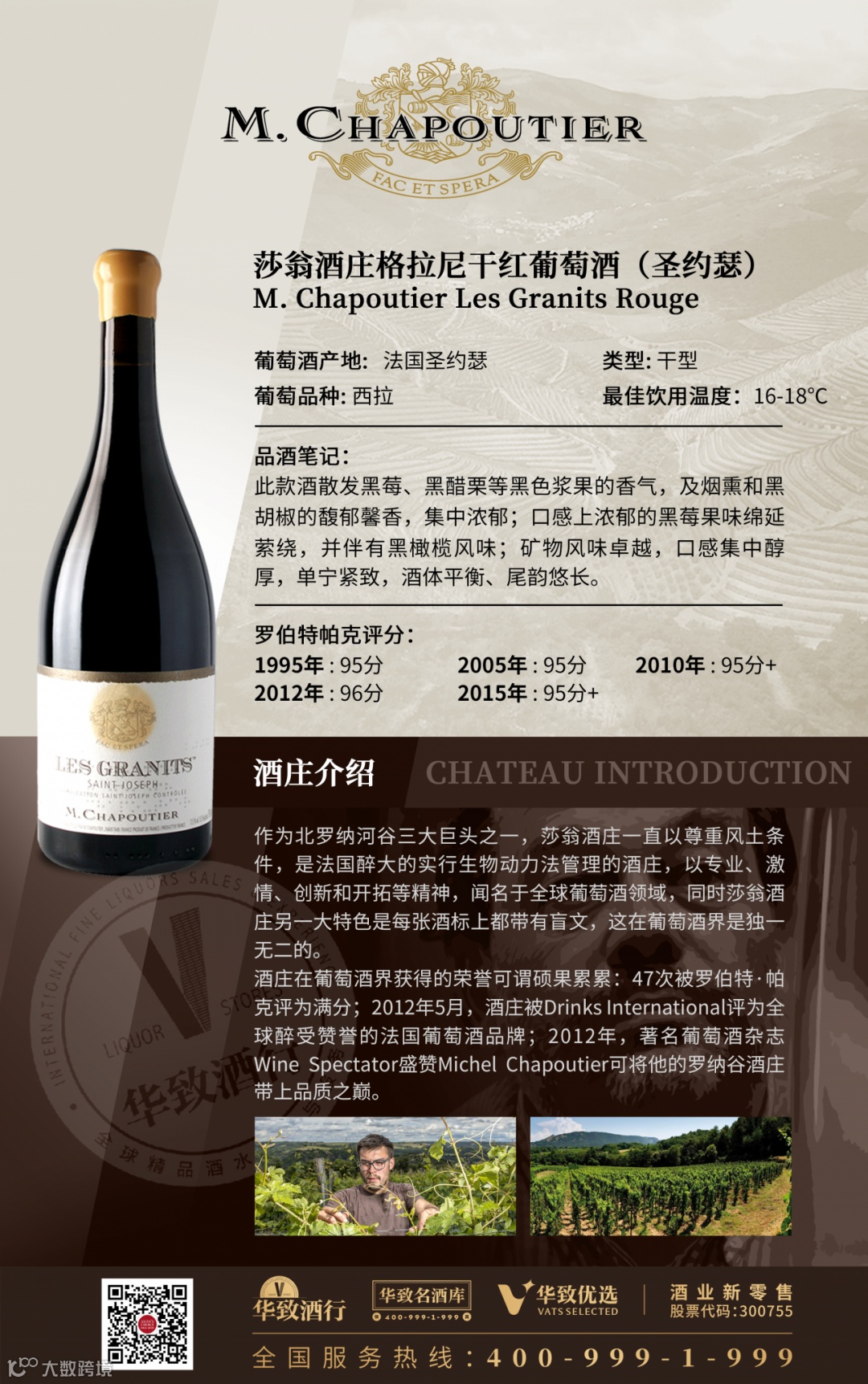 同时,酒庄在葡萄酒界获得的荣誉可谓硕果累累:47次被罗伯特·帕克评为满分,Drinks International评选其为全球醉受赞誉的法国葡萄酒品牌;著名葡萄酒杂志Wine Spectator盛赞米歇尔·莎翁(M.Chapoutier)可将他的罗纳谷酒庄带上品质之巅.....