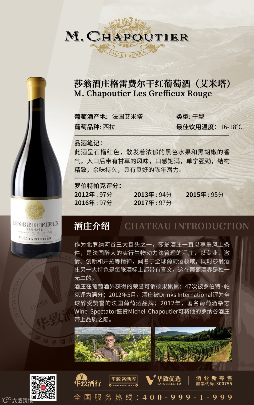 Drinks International评选其为全球醉受赞誉的法国葡萄酒品牌;著名葡萄酒杂志Wine Spectator盛赞米歇尔·莎翁可将他的罗纳谷酒庄带上品质之巅.....Wine Label