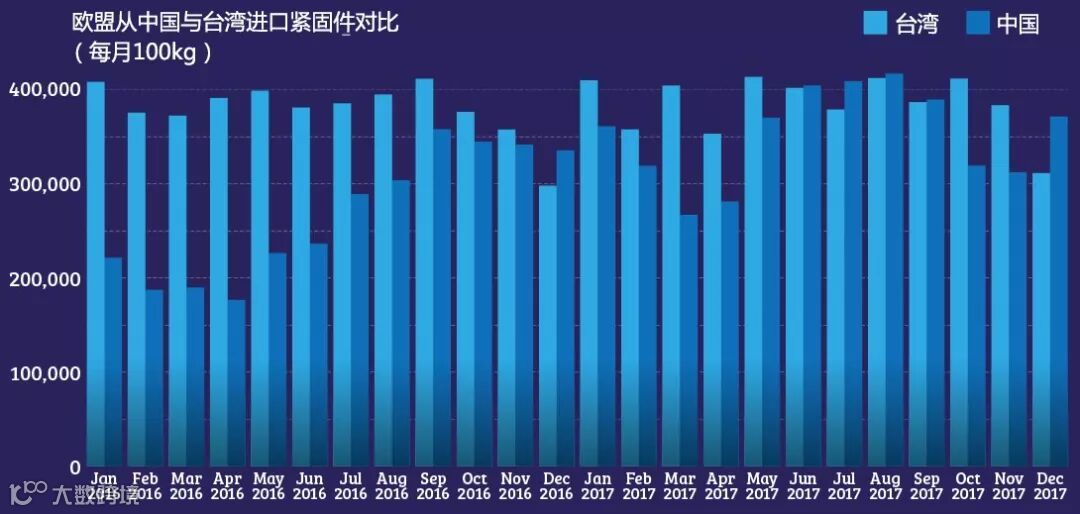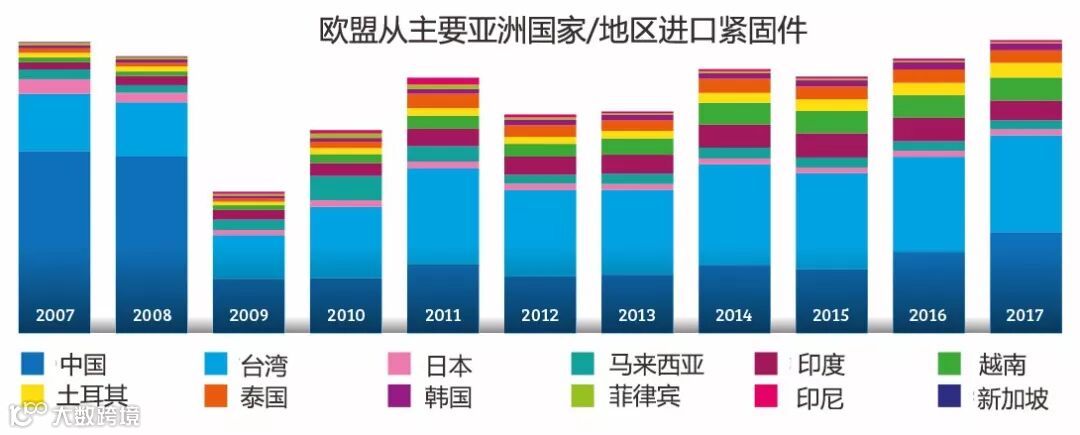 以上图表概括了2007年至2017年十年间欧盟从亚洲地区进口的钢制/铁制紧固件(海关编码7318)情况。图表显示,在欧盟反倾销税实施之前,欧盟进口紧固件国家(或地区)中,中国大陆占据支配性的市场份额。2009年至2010年间,虽然可以看得出来欧盟进口紧固件市场受到了关税的影响,但是总的进口量也受到了金融危机的抑制。在此期间,欧盟的库存大大削减,更倾向于小规模、短时间的采购。不过2011年后,随着市场复兴,进口商们开始转向大规模、长时间的合作采购,采购地区重新转向中国台湾。可以看出,即使欧盟撤销了对中国大陆紧企的紧固件反倾销税,从中国台湾进口的紧固件也持续增长。