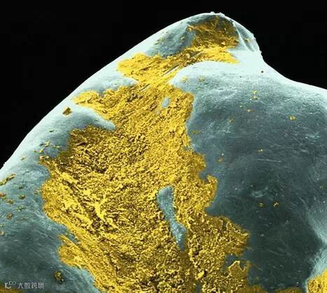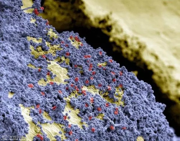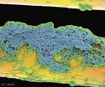 牙齿表面附着着大量黄色牙板,牙板上则是更多的蓝色球形地毯细菌