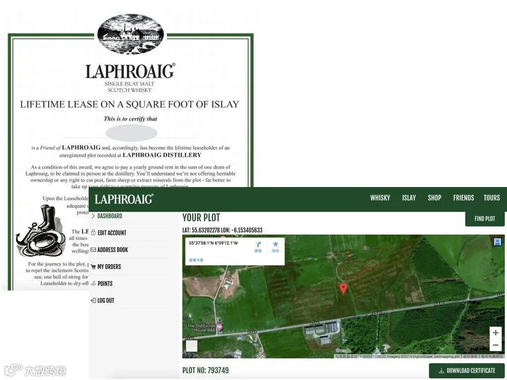 拉弗格有个有趣的营销方式,购买任何一瓶拉弗格威士忌的人,都可以官网注册成为拉弗格俱乐部成员(Friends of Laphroaig),认领1平方英尺艾雷岛的土地,成为“地主”然后“出租”给拉弗格酒厂,而酒厂每年“支付”每位成员 a free dram! 一小瓶拉弗格威士忌作为“租金”,待你有机会抵达艾雷岛可以去酒厂兑现。