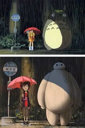 是不是看起来毫无违和感呢?没错!大白的整体造型灵感就是来自于龙猫,上图第二张正是迪士尼动画工作室人物设计总监金进所绘,致敬龙猫的海报。