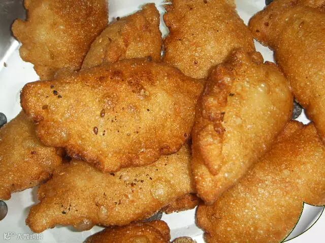 2、把一定比例的面粉、鸡蛋、白糖、猪油加入少许水不断搅拌,再用面杖压成饺子皮样(与北方包饺子相似),把干馅放入面皮捏成饺子样;