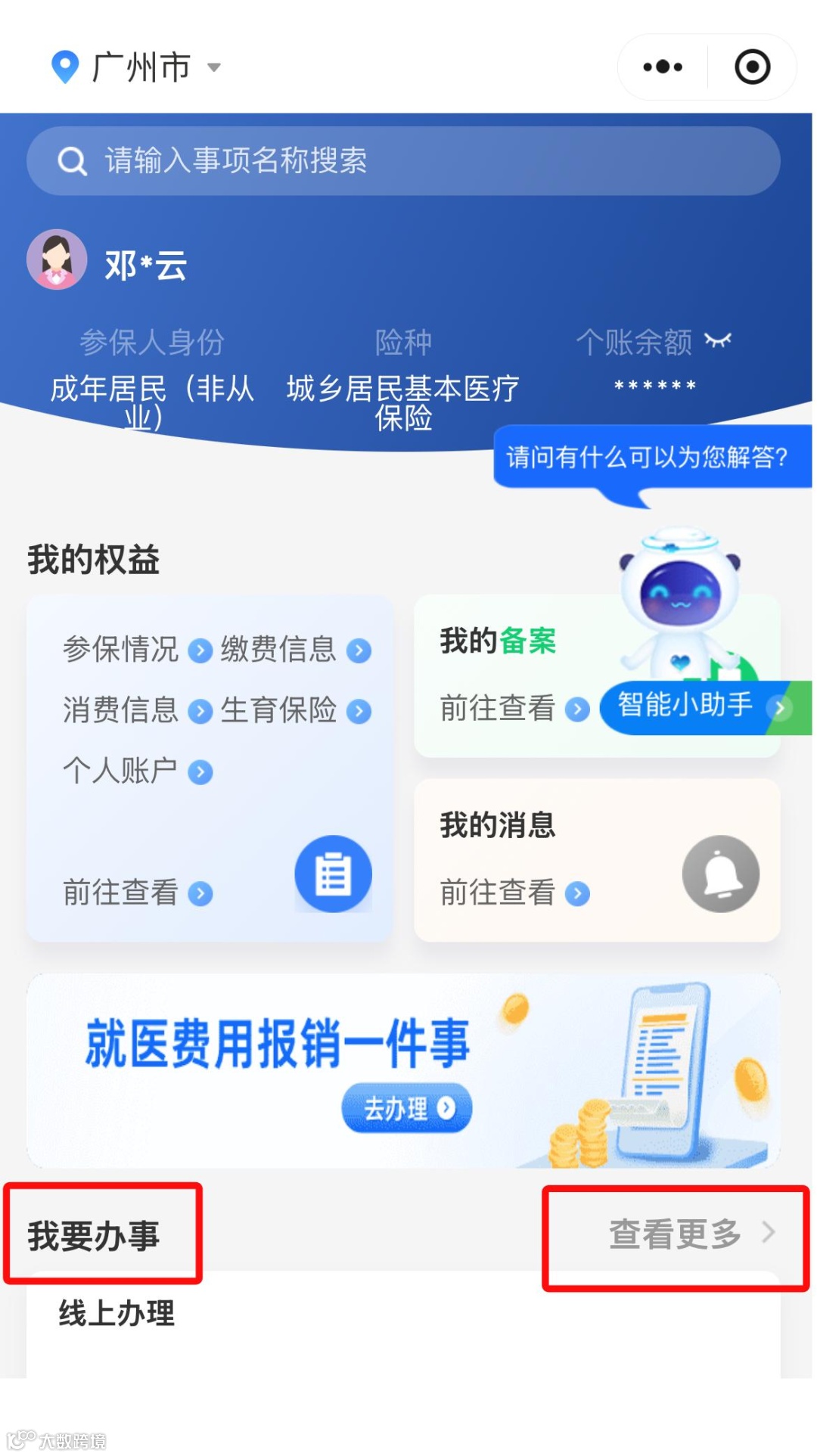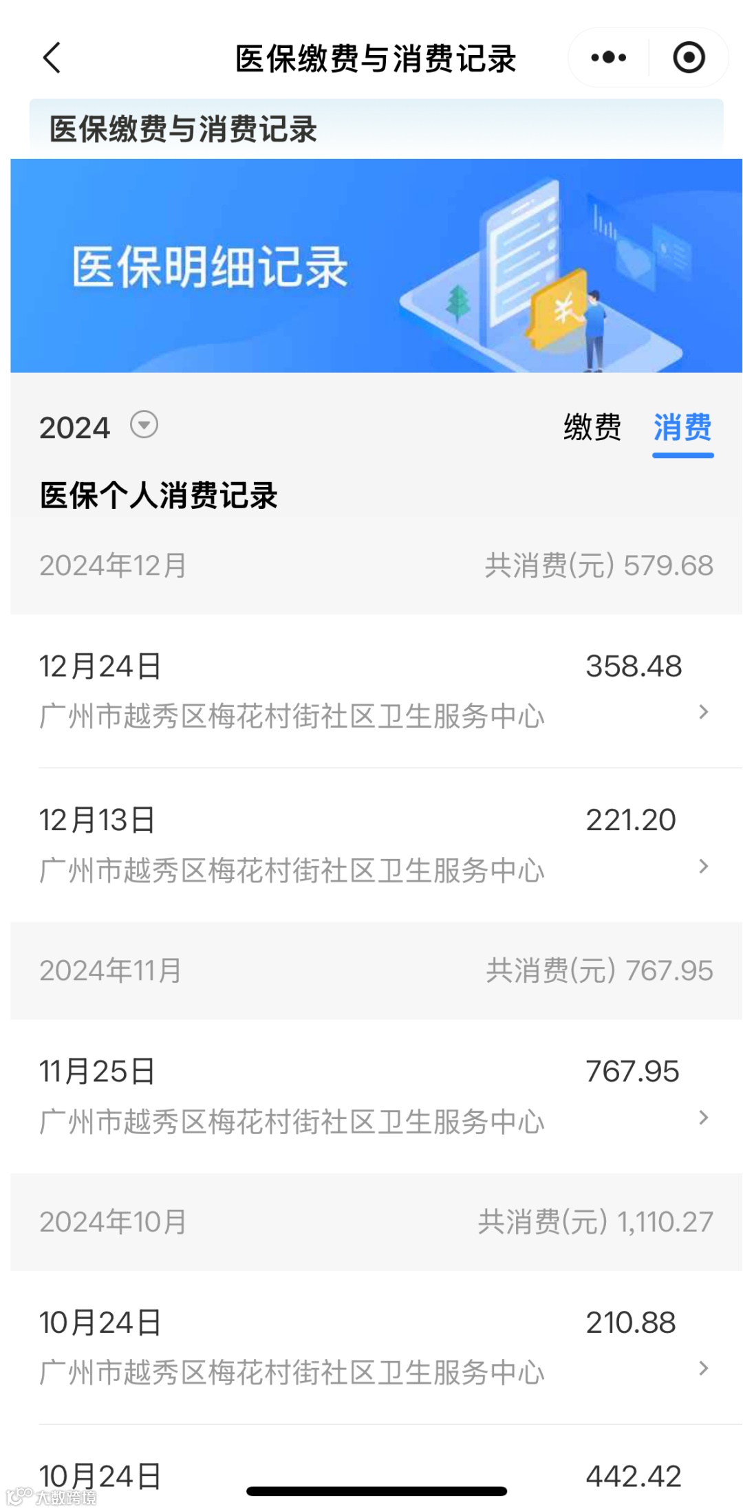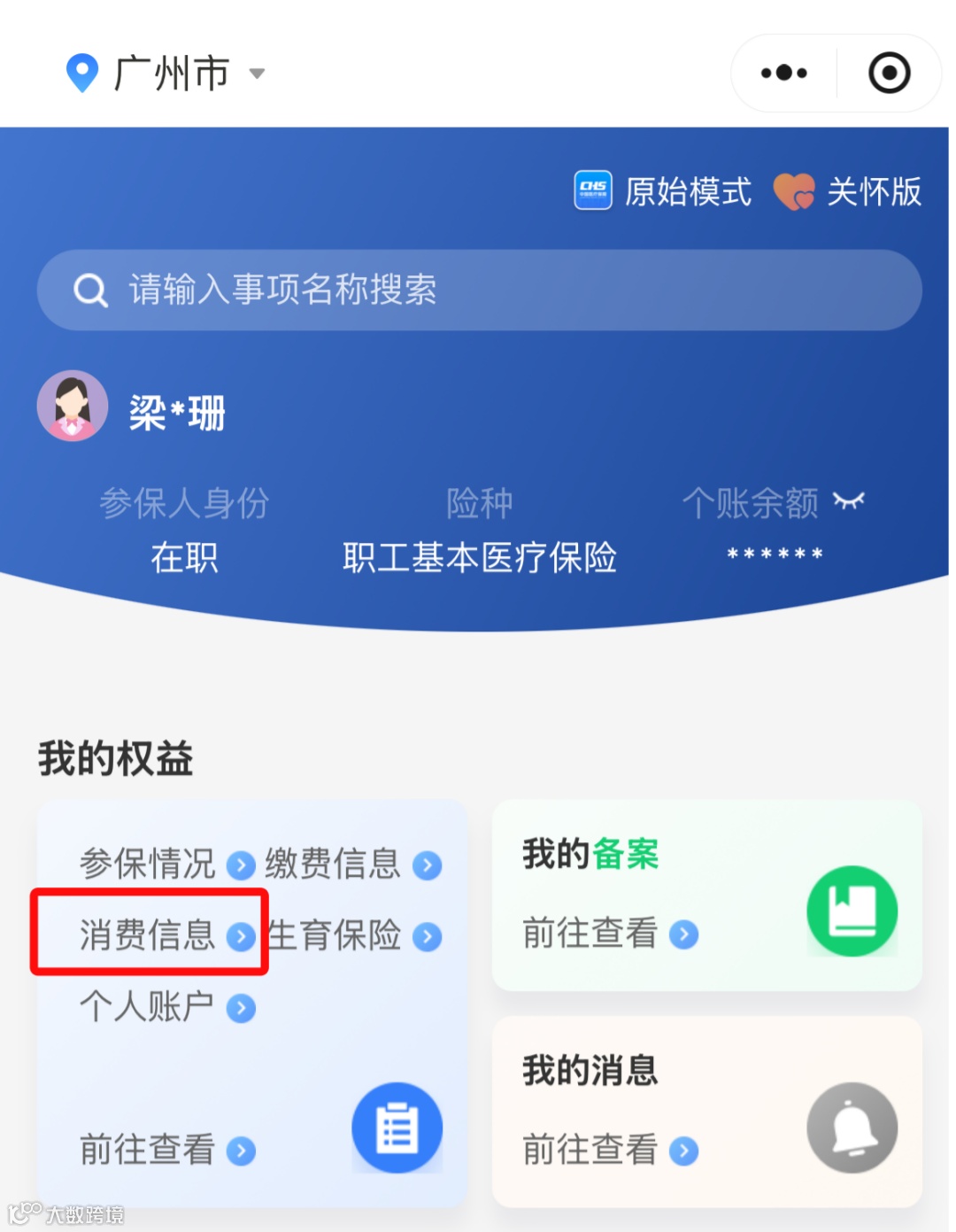 也可通过粤医保首页的“我要办事—查看更多—业务查询—医保缴费与消费记录—消费”,选择对应年份查询医保费用。