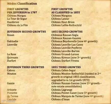 早在1787年杰弗逊就已经对波尔多进行了分级,此图为68年后的1855年巴黎世博会分级和他自己对波尔多排名的对比基本大致相同,可见其对葡萄酒品鉴的功力。