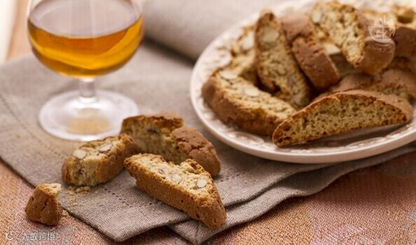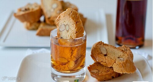 与biscotti最经典的意式搭配是Vin Santo,意思是圣酒,它是意大利一种著名的餐后甜酒,常由白葡萄品种trebbiano和malvasia酿造,和cantucci一样,同样源自托斯卡纳。Cantucci和Vin Santo作为一道甜点共同出现,不仅因为更美味也为了不让你牙齿被坚硬的脆饼崩掉,脆饼希望它是被蘸着圣酒吃的。