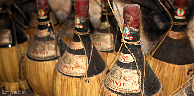 这种近似球形的葡萄酒瓶,加上外面包裹的草编篮子,很难让人把视线从它身上移开——这是康帝产区(Chianti)一种传统的葡萄酒瓶,但在今天已经不多见了。