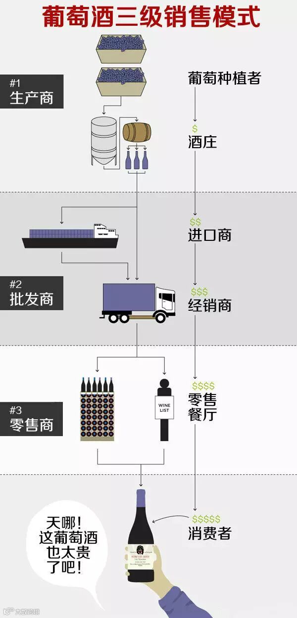 当你买了一瓶葡萄酒,你肯定想象不到在这之前它经过了多少人之手。从葡萄酒生产出来直到消费者购入,整个过程可以统称为葡萄酒三级销售模式。