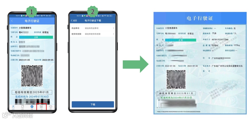 具体操作为:点击电子行驶证下方【下载】按钮,本人直接出示的填写用途事项和有效期后下载,授权出示的直接下载。下载的电子行驶证加注使用人、用途事项和有效期限水印,有效期最长为7个工作日。