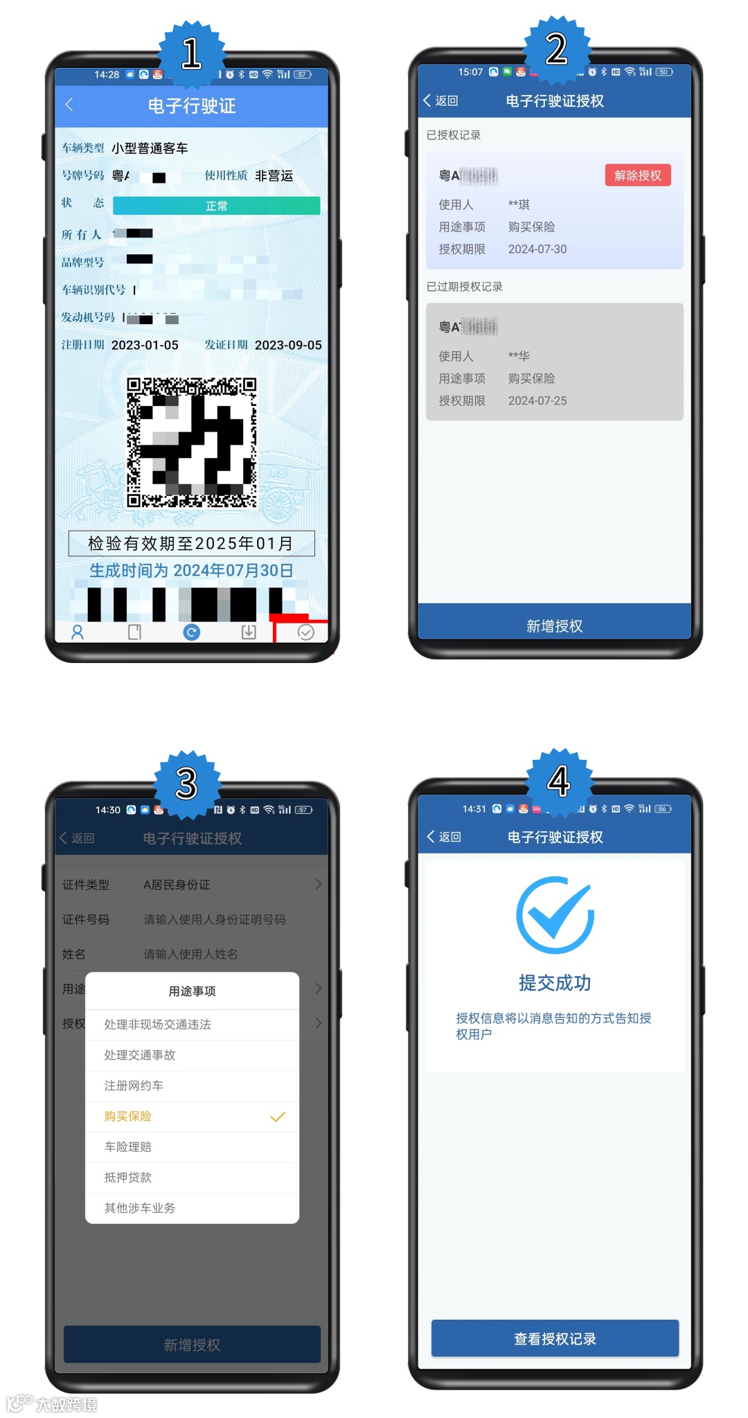 点击电子行驶证下方【授权】按钮进入授权列表,点击页面下方【新增授权】,填写被授权人身份证号、姓名和授权有效期,选择用途事项,提交授权。提交后被授权人电子证件列表中将增加授权电子行驶证列表项,用户可点击显示授权出示的电子行驶证。