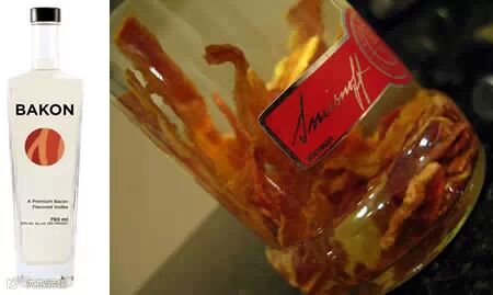 也许是蛇酒的制作让老外产生了启发。既然蛇可以泡酒,培根可不可以泡酒。。。好吧有时候你不得不佩服老妹那种阿拉斯加拉扯着狗一样的联想思维。于是这款用伏特加泡制的培根酒诞生了。这款充满肉香的酒很适合做血腥玛丽鸡尾酒。