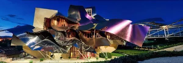 瑞格尔侯爵酒店外围绕着起伏的金属结构,有三种颜色:粉色代表葡萄酒,金色代表酒瓶外的包装,而银色代表着瓶口的装饰。这座位于老酒窖上面的酒店,将解构主义理念的夸张、拆散、扰乱、动势表现得淋漓尽致,利用沸腾的曲线,将创造失去中心的建筑等观念诠释得入木三分,让世人为之震惊,称之为世间最美,丝毫不为过!