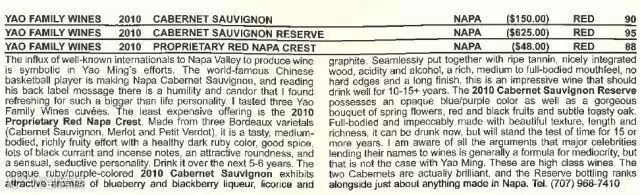 文章的最后,帕克强调:“我知道名人葡萄酒总是会充满争议,这些酒经常被认为是平庸之作,但姚明的酒显然是个例外,这几款酒有非常高的水准,尤其是纳帕谷和家族珍藏这两款赤霞珠表现得十分优秀,家族珍藏完全可以媲美纳帕谷的任何好酒。”
