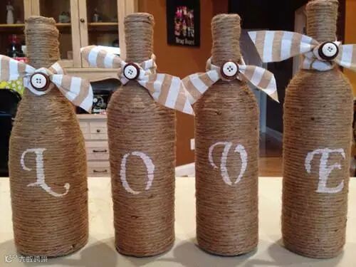 麻绳,给人以质朴、田园的感觉,用这一元素给小家做一些点缀肯定会收获意想不到的温馨浪漫。可别以为制作一个麻绳酒瓶很简单,绳子一圈一圈地要码紧,白乳胶不能一次性全部刷完,麻绳断了有接头会不好看……不仅是个力气活,细心和耐心更是关键。