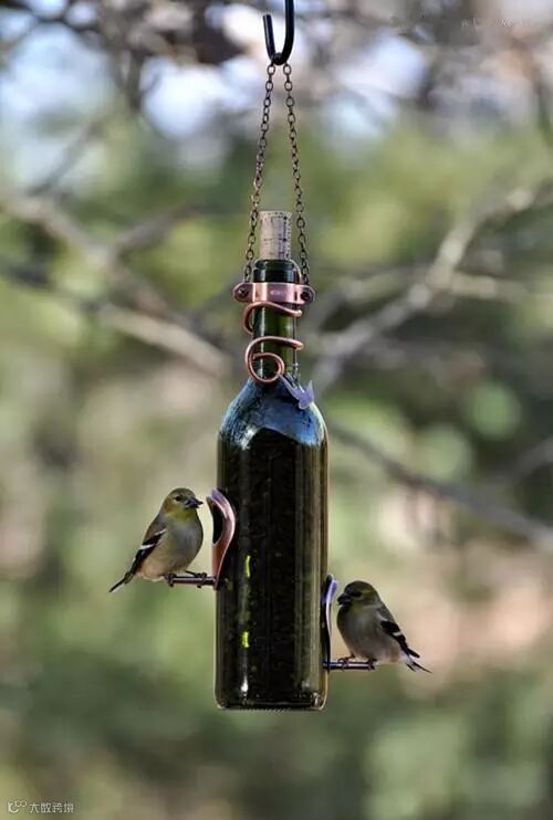 美酒,也要学会和小鸟分享哦。虽然这个技术性极高的精美装饰很难自己DIY出很好的效果——瓶口需要完美地切割,配套的零件也不是随便就能找到,给小鸟站立的支架也不好安装……不过,从这个有爱器件和小鸟共存的和谐画面可以感受到分享是一件多么快乐的事情。