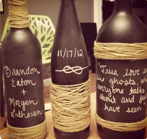 你可以去化工油漆店里买到黑板漆,均匀喷涂在酒瓶上,然后再做一些简单的装饰,一块360°酒瓶小黑板就做好啦。它不仅可以作为复古装饰品,也有实际便利贴的功能。要相信黑板和粉笔这一组搭配有着哆啦A梦时光机般神奇的效果,看到它定能回忆起童年的最美时光。
