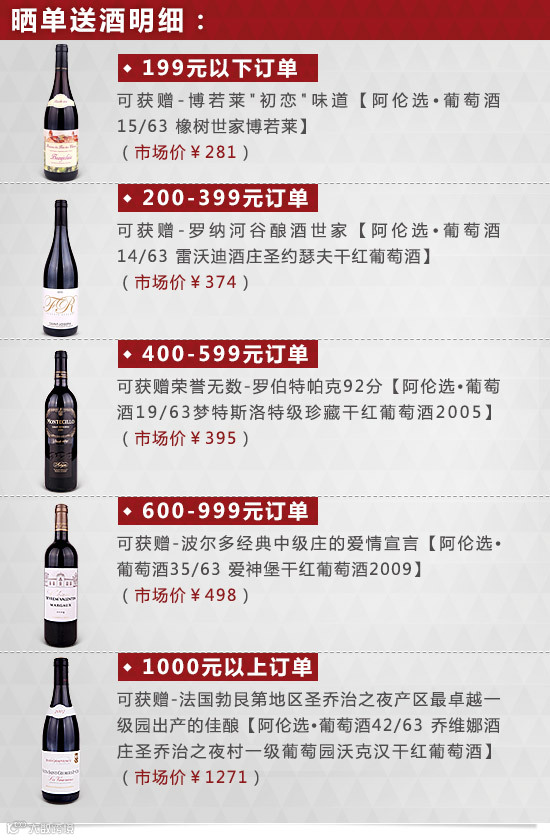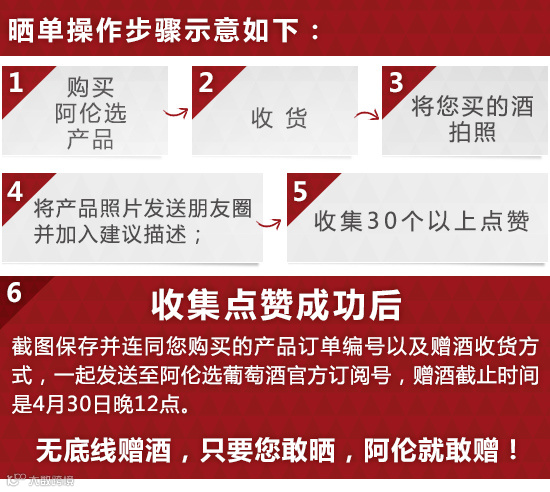 在阿伦选·葡萄酒京东商城购买任何阿伦选产品,只要您将网购的阿伦选·葡萄酒任意一款产品,拍照后在微信朋友圈晒单,集齐30个以上的有效点赞并将朋友圈截图、订单号(2014年4月10日起的订单都有效)和赠酒收货方式发送给阿伦选·葡萄酒订阅号,即可免费再获得阿伦选产品一瓶!
