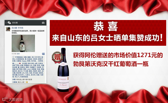 昨天开始的“您晒单集赞、阿伦来赠酒”活动引爆阿伦粉丝极大热情,大家纷纷参与晒单赠酒活动。其中,来自山东的吕女士成为了“今日之星”,免费获赠市场价值1271元的法国勃艮第乔维娜酒庄圣乔治之夜村一级葡萄园沃克汉干红葡萄酒一瓶!