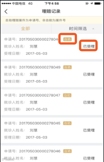 对于自助申请的案件,案件后方有“自助”标识,以及“案件状态”