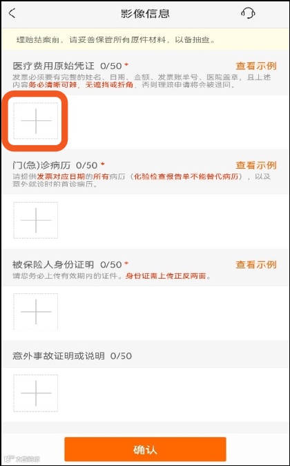 点击【+】按要求上传报销材料影像