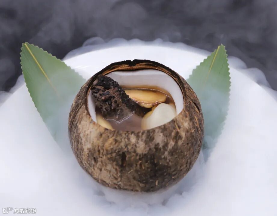 Double Boiled Coconut with Matsutake, Fish Maw & Sea Cucumber Soup