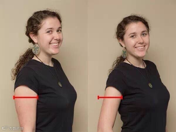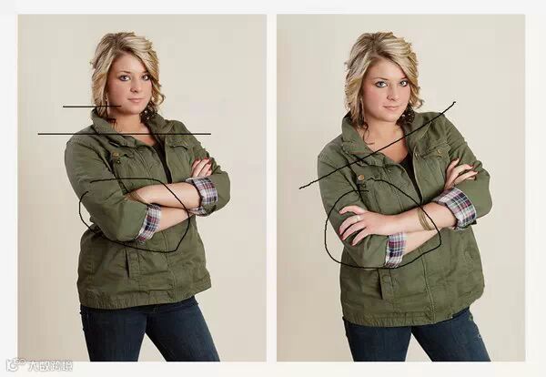 不要让你的大臂紧贴在身上,很显然,左图大臂被压扁了,从相片里看,很是显胖。右侧则是将大臂和肩膀打开,是不是更有质感?