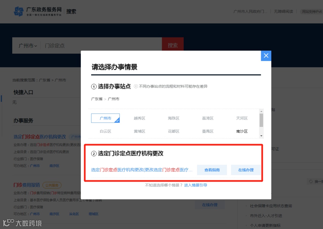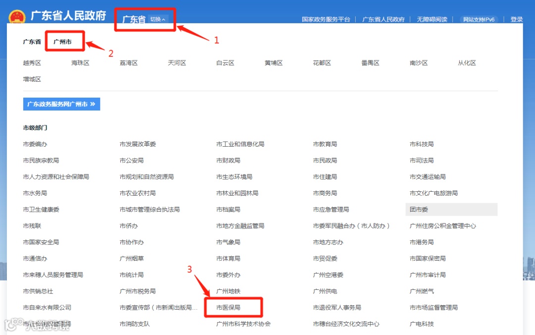 2、左上角选择职能部门→广州市→市医保局;