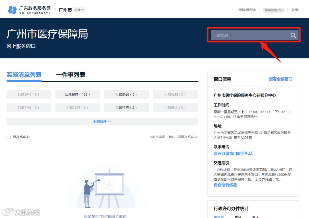 3、页面跳转到广州市医疗保障局→输入需要办理的业务关键词→“门诊定点”搜索;