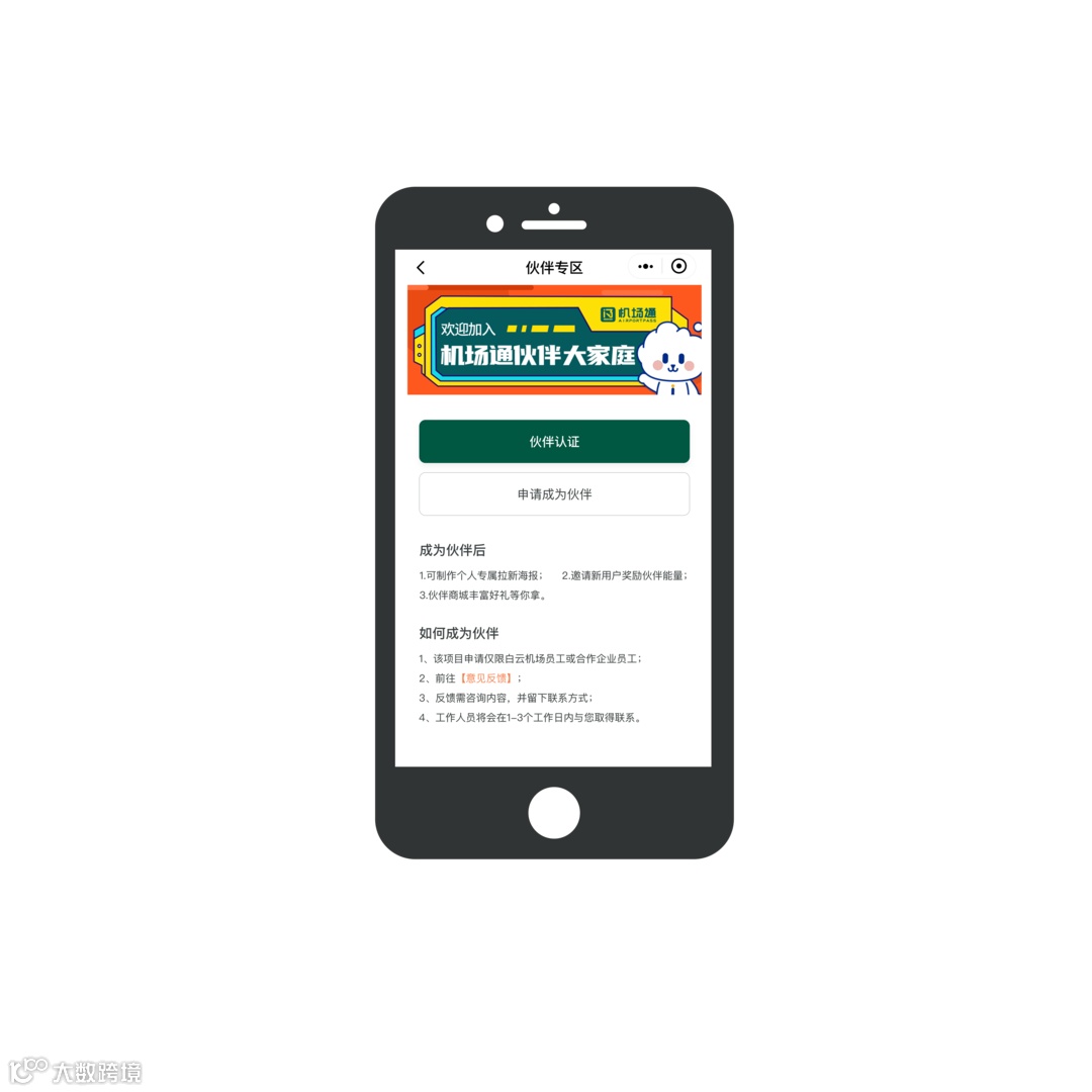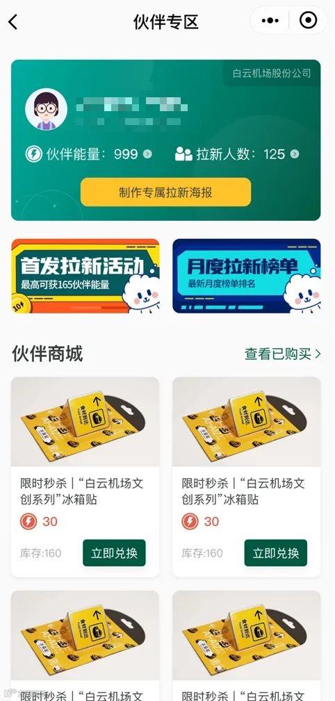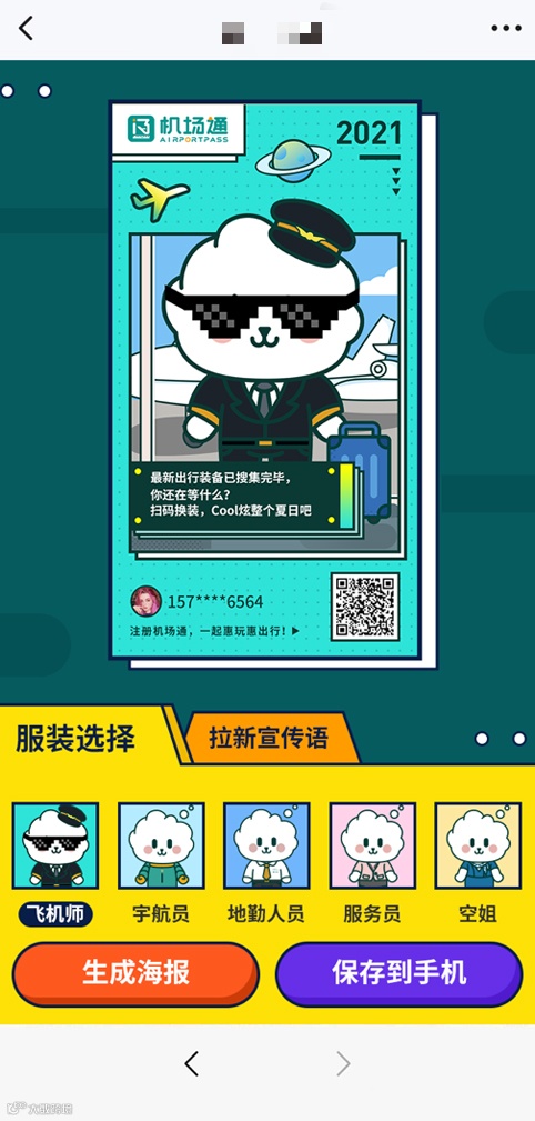 白云机场员工登录机场通会员中心,进入【伙伴专区】,输入员工编号进行认证,成功后点击【制作专属拉新海报】,即可根据个人喜好、岗位等选择模板,生成个人专属二维码,邀请旅客或好友扫码注册机场通会员即可累积能量。