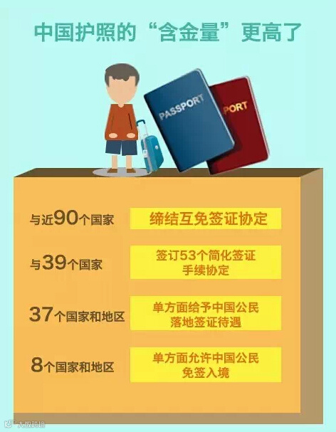 中国与近90个国家缔结了互免签证协定。其中不乏一些发达或热门旅游国家包括:阿根廷、阿联酋、巴西、韩国、马尔代夫、泰国、新加坡、英国、越南等。另外,土库曼斯坦、格鲁吉亚、俄罗斯、白俄罗斯、阿塞拜疆对团体旅游签证互免签证。