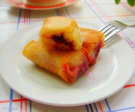 食材:香蕉1根、 油适量、春卷皮适量、蓝莓酱适量