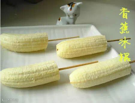 做法:用那种熟透的非常甜的香蕉,切段(如果有合适的竹签也可以用整个香蕉),插上牙签,放冰箱冷冻。