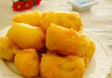 7)油烧至7成热时,下挂了糊的香蕉块慢炸。