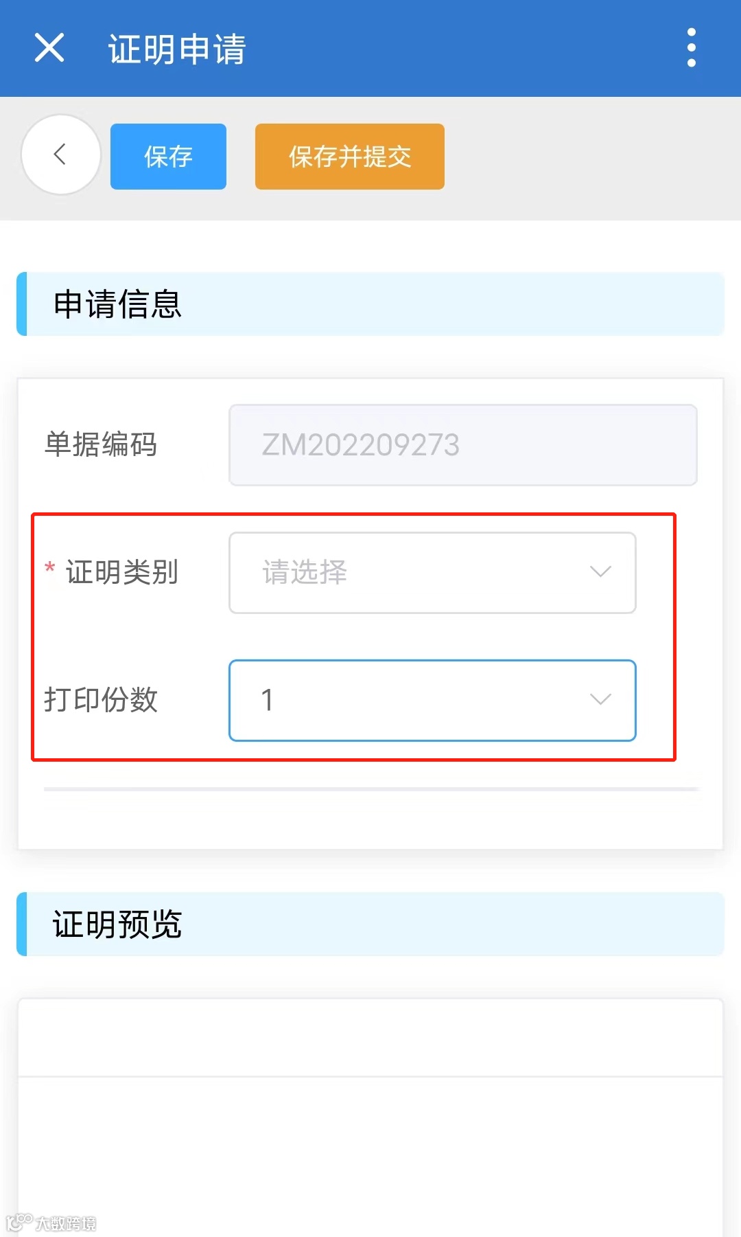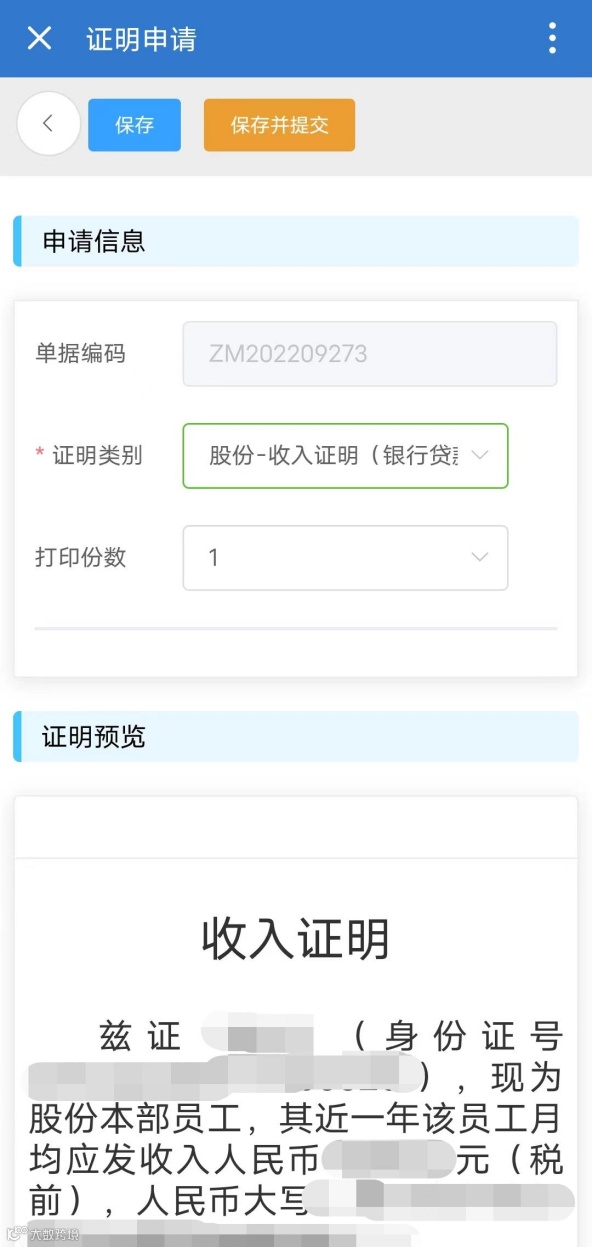 4、可以通过【证明预览】浏览证明样式,确认无误后点击【保存并提交】,审批立即通过: