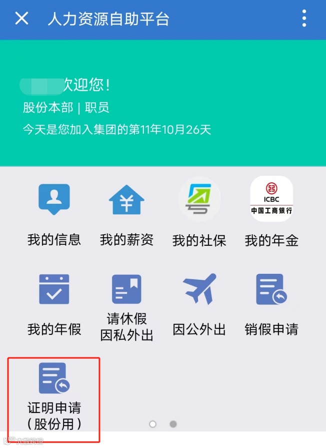 1、打开企业微信【人力资源自助】,点击【证明申请(股份用)】,打开证明申请界面:
