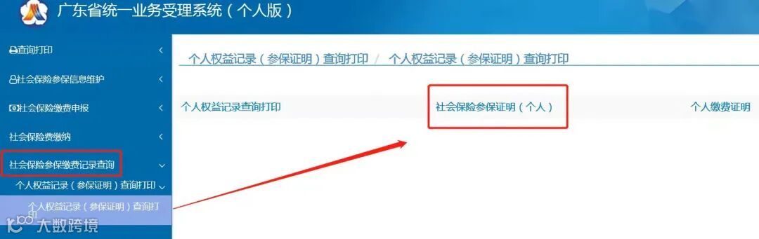 个人账户登录后,在左侧菜单栏找到【社会保险参保缴费记录查询】,点击下方【个人权益记录(参保证明)查询打印】即可看到选项。
